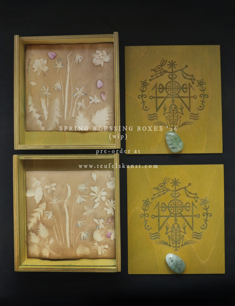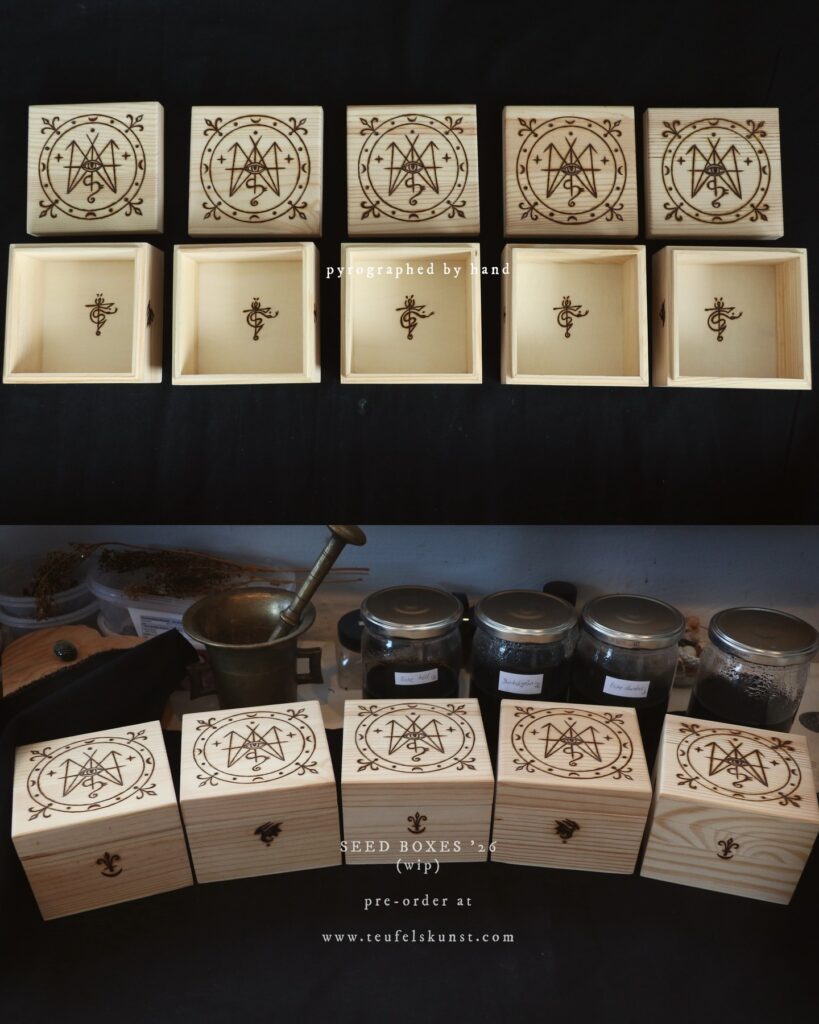 Preview of new spring treasure boxes taking shape: as Ostara approaches, I am spending every free hour on completing these works. The spring blessing boxes have received their pyrogravure (done with a laser printer), simultaneously the new set of seed boxes have been pyrgraphed (by hand). The Spring boxes are colored in a yellow green inspired by the catkins of birch and hornbeam and come with miniature phytograms, a beautiful prehnit tumblestone pendant and some more extras. The seed boxes also received their colors today. More details and photos of the ready boxes will follow the coming days…