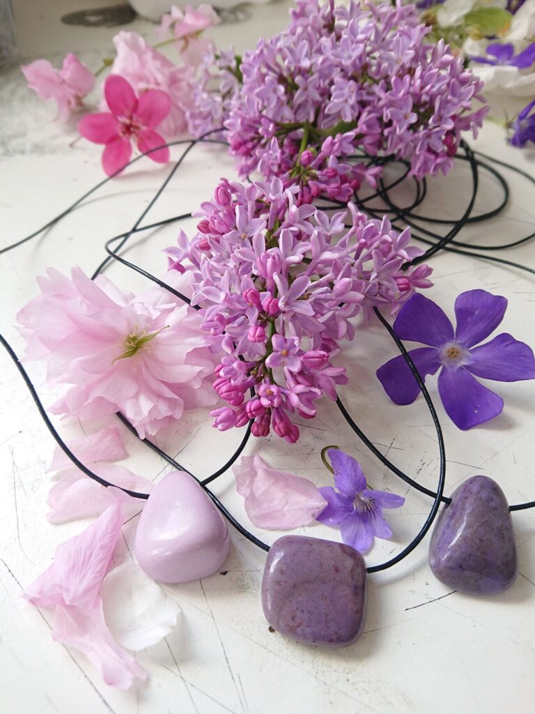 Meanwhile, and while waiting for last seed and tumble stone orders to arrive, I’ve been digging further into the wonders of stones (mainly their colors and appearance, but also their alleged esoteric qualities)… now the Beltane boxes come with gorgeous and rare lavender jade pendants, hopefully blessing its wearer with inner and outer peace. In addition I am awaiting the arrival of four rare green (!) moonstones, vibrant yellow-green lizzardite and purple stichtit inside of serpentine to be included in the next treasuries…