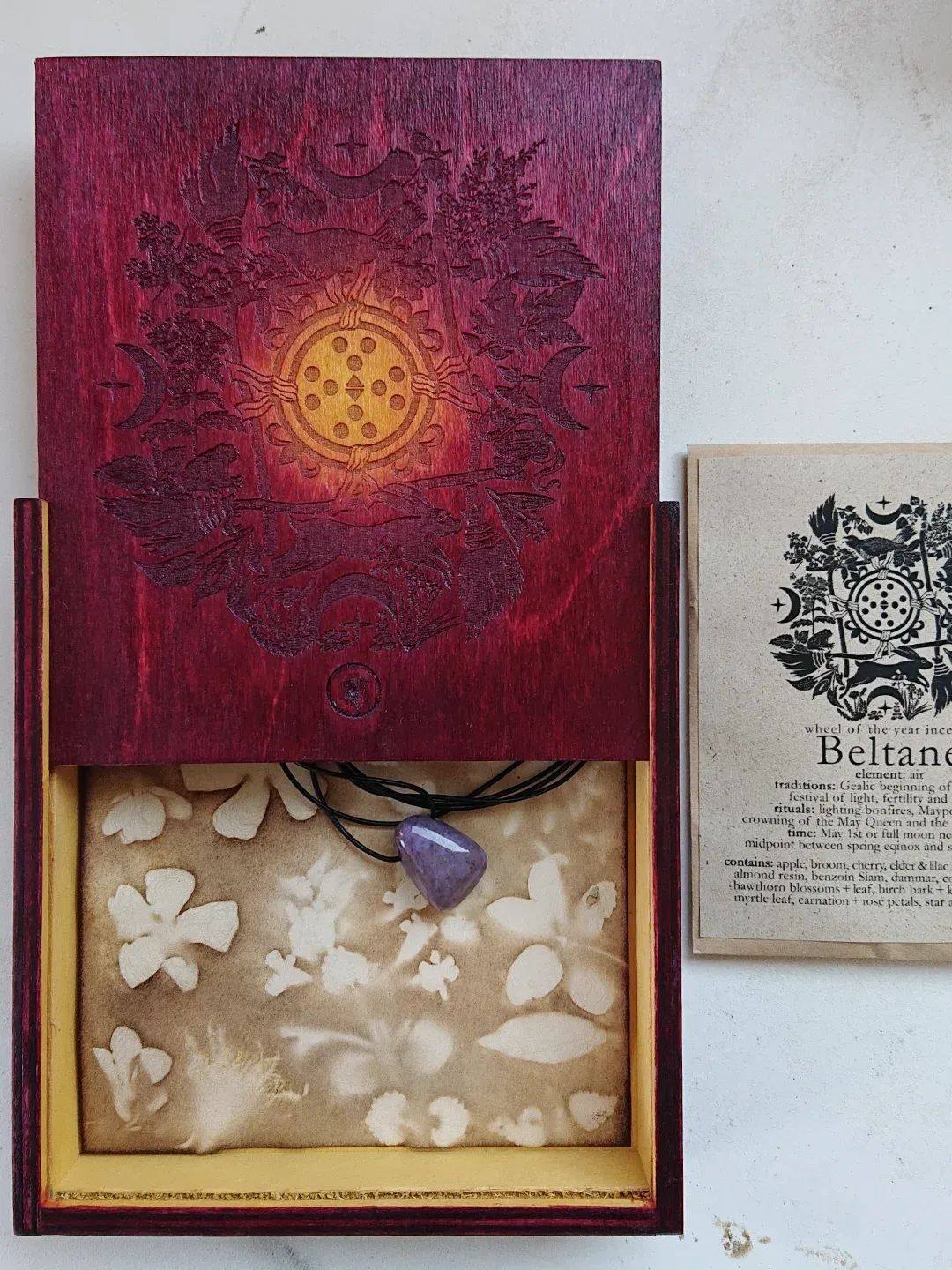This box is a treasury of items dedicated to the rituals of Beltane. On the box lid is lasered in fine detail the Beltane seal, featuring the spirit’s round dance around the birch May pole…